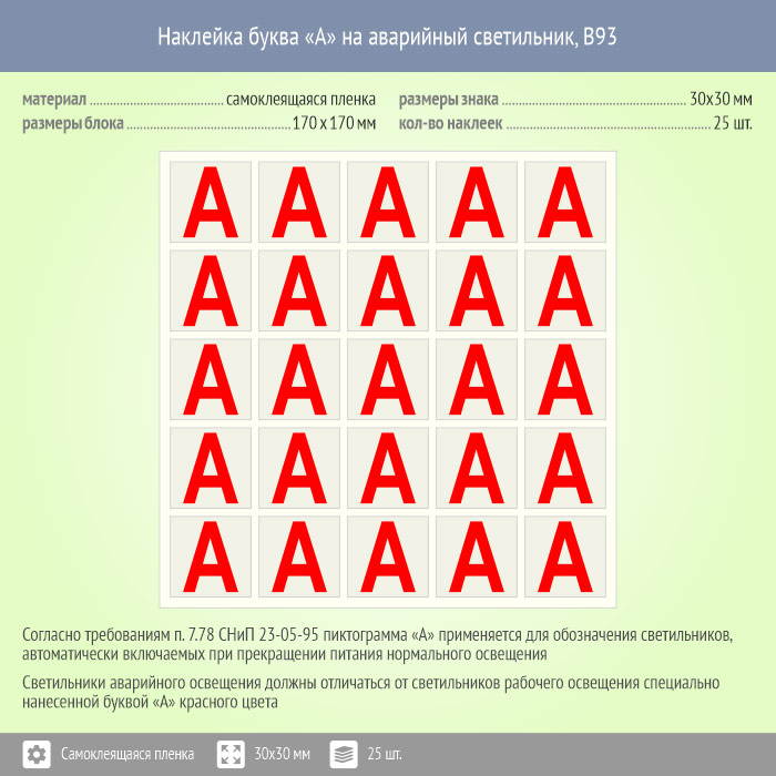 Наклейка буква «А» на аварийный светильник, B93 (пленка, 30х30 мм, блок 25 штук, 170х170 мм) в Волжском купить
