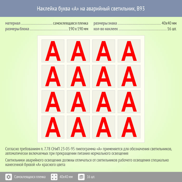 Наклейка буква «А» на аварийный светильник, B93 (пленка, 40х40 мм, блок 16 штук, 190х190 мм) в Волжском купить