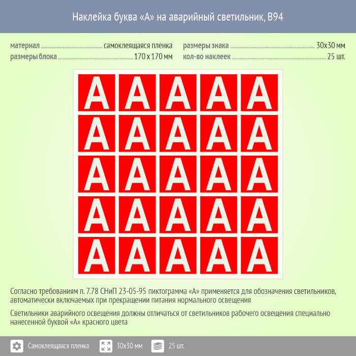 Наклейка буква «А» на аварийный светильник, B94 (пленка, 30х30 мм, блок 25 штук, 170х170 мм) в Волжском купить