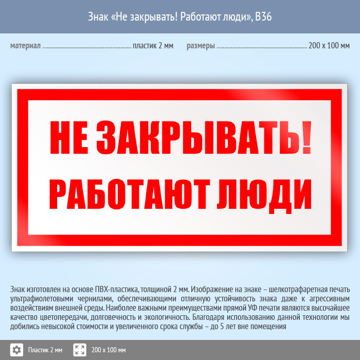 Знак «Не закрывать! Работают люди», B36 (пластик, 200х100 мм) в Волжском купить