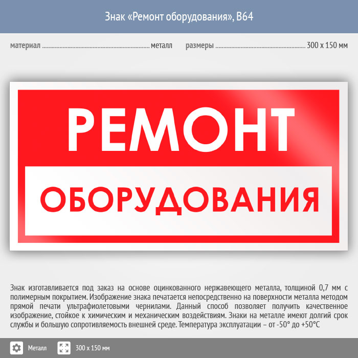 Знак «Ремонт оборудования», B64 (металл, 300х150 мм) в Волжском купить