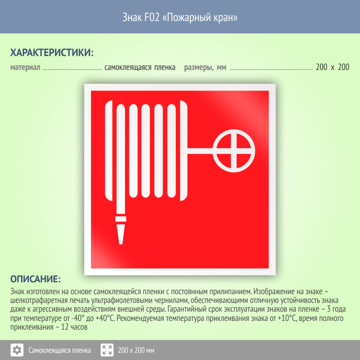 Знак «Пожарный кран» может быть изготовлен любого размера на самоклеящейся пленке, пластике толщиной 0.5, 2 или 4 мм и металле. Также возможно применение фотолюминесцентных и световозвращающих материалов