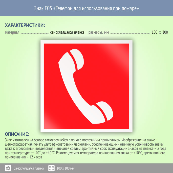 Знак F05 «Телефон для использования при пожаре (в том числе телефон прямой связи с пожарной охраной)» (пленка, 100х100 мм) в Волжском купить