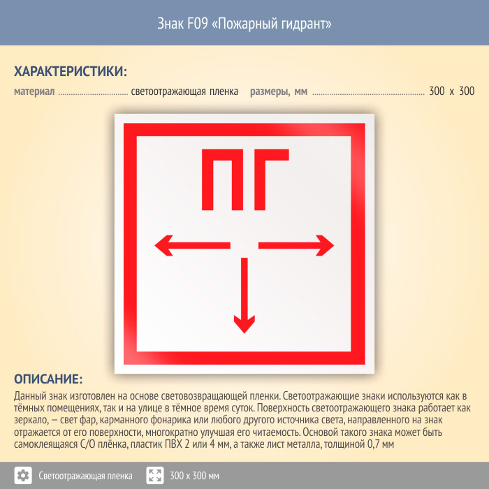 Знак F09 «Пожарный гидрант» (светоотражающая пленка, 300х300 мм) в Волжском купить