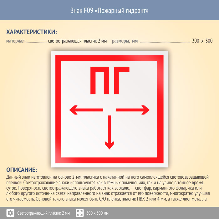 Знак F09 «Пожарный гидрант» (светоотражающий пластик, 300х300 мм) в Волжском купить
