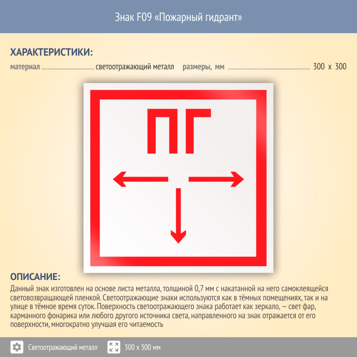 Знак F09 «Пожарный гидрант» (светоотражающий металл, 300х300 мм) в Волжском купить