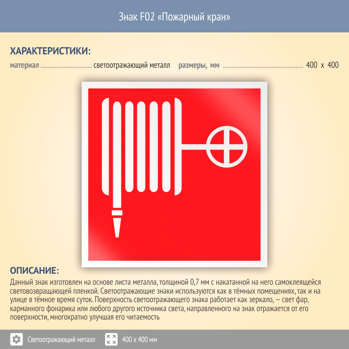 Знак F02 «Пожарный кран» (светоотражающий металл, 400х400 мм) в Волжском купить