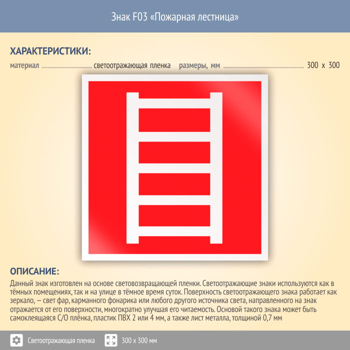 Знак F03 «Пожарная лестница» (светоотражающая пленка, 300х300 мм) в Волжском купить
