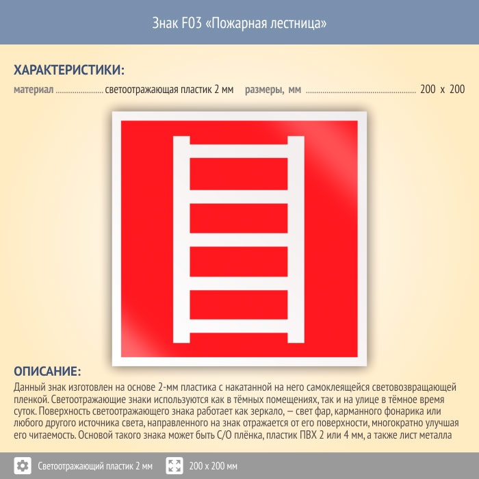 Знак F03 «Пожарная лестница» (светоотражающий пластик, 200х200 мм) в Волжском купить