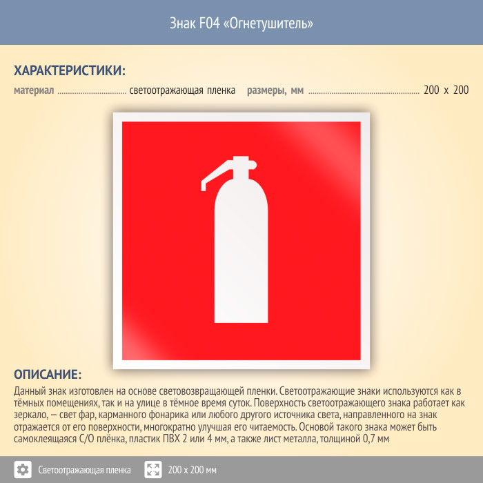 Знак F04 «Огнетушитель» (светоотражающая пленка, 200х200 мм) в Волжском купить