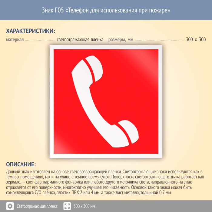Знак F05 «Телефон для использования при пожаре (в том числе телефон прямой связи с пожарной охраной)» (светоотражающая пленка, 300х300 мм) в Волжском купить