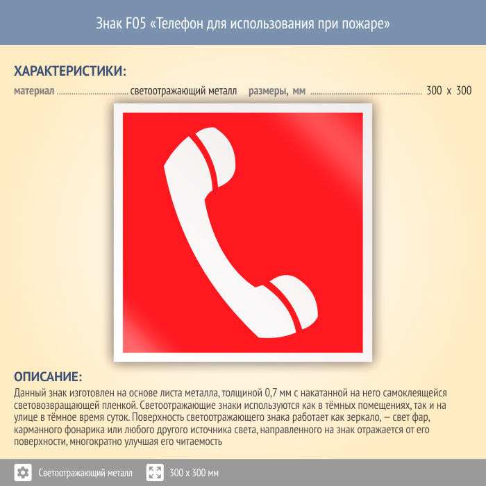Знак F05 «Телефон для использования при пожаре (в том числе телефон прямой связи с пожарной охраной)» (светоотражающий металл, 300х300 мм) в Волжском купить