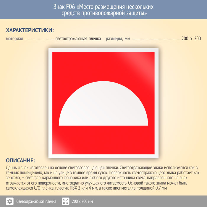 Знак F06 «Место размещения нескольких средств противопожарной защиты» (светоотражающая пленка, 200х200 мм) в Волжском купить