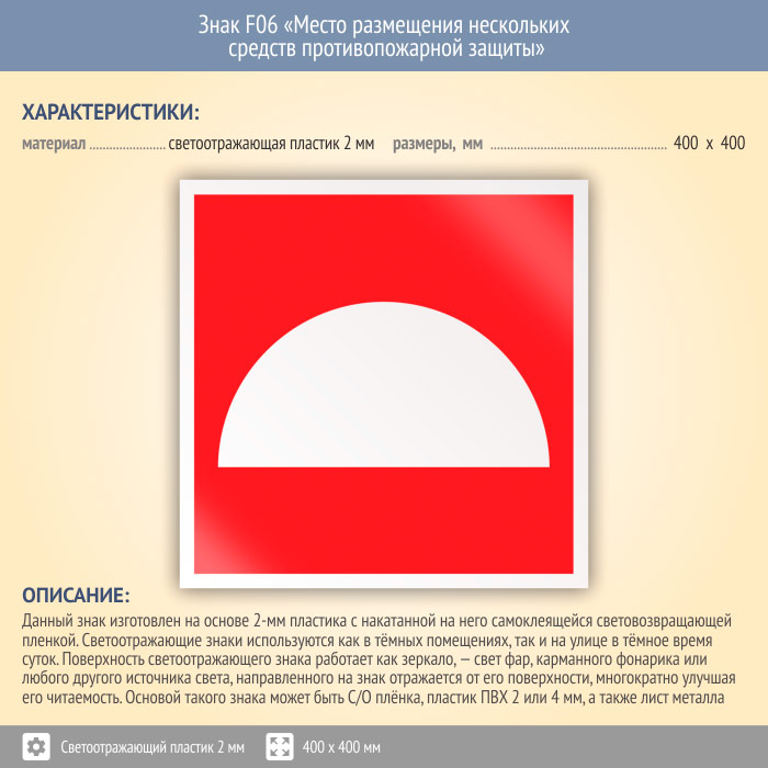 Знак F06 «Место размещения нескольких средств противопожарной защиты» (светоотражающий пластик, 400х400 мм) в Волжском купить