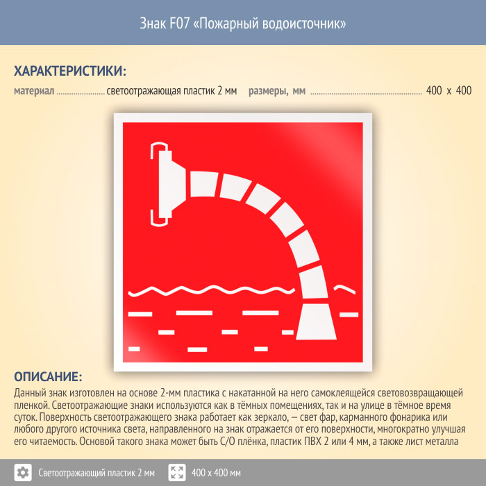 Знак F07 «Пожарный водоисточник» (светоотражающий пластик, 400х400 мм) в Волжском купить