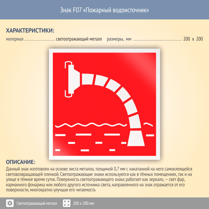 Знак F07 «Пожарный водоисточник» (светоотражающий металл, 200х200 мм) в Волжском купить