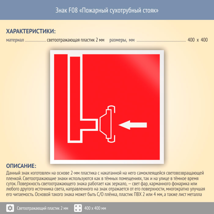 Знак F08 «Пожарный сухотрубный стояк» (светоотражающий пластик, 400х400 мм) в Волжском купить