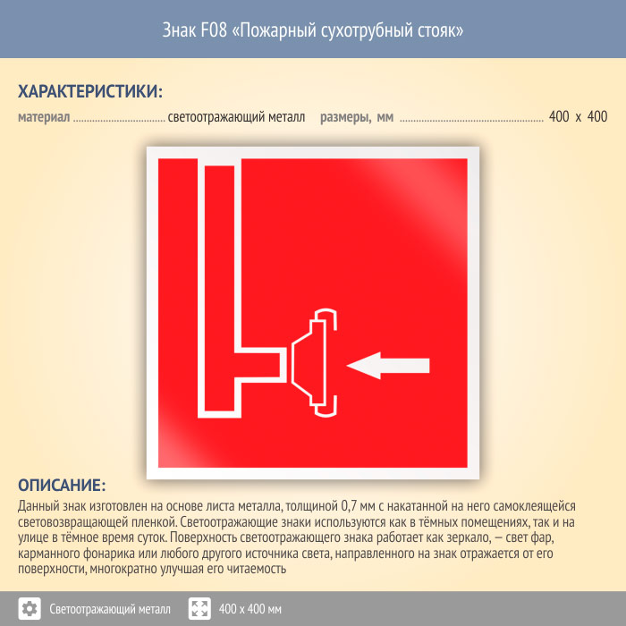 Знак F08 «Пожарный сухотрубный стояк» (светоотражающий металл, 400х400 мм) в Волжском купить