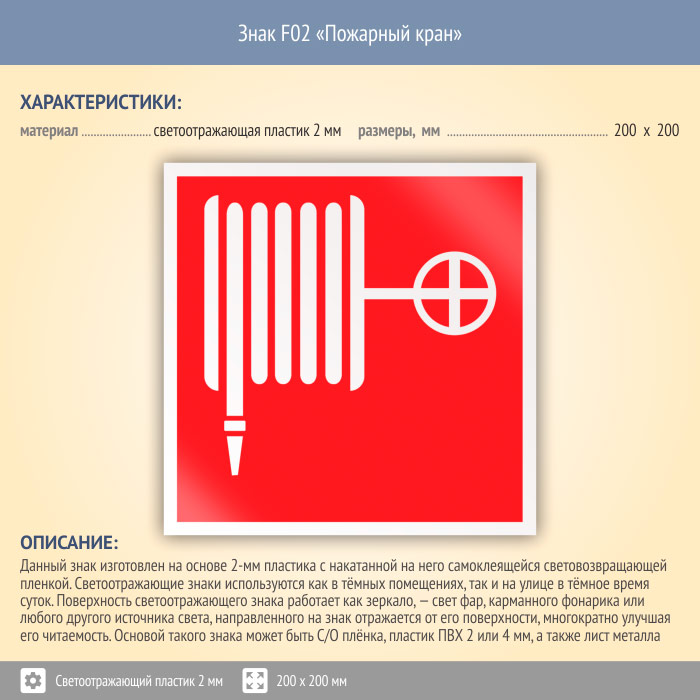 Знак F02 «Пожарный кран» (светоотражающий пластик, 200х200 мм) в Волжском купить