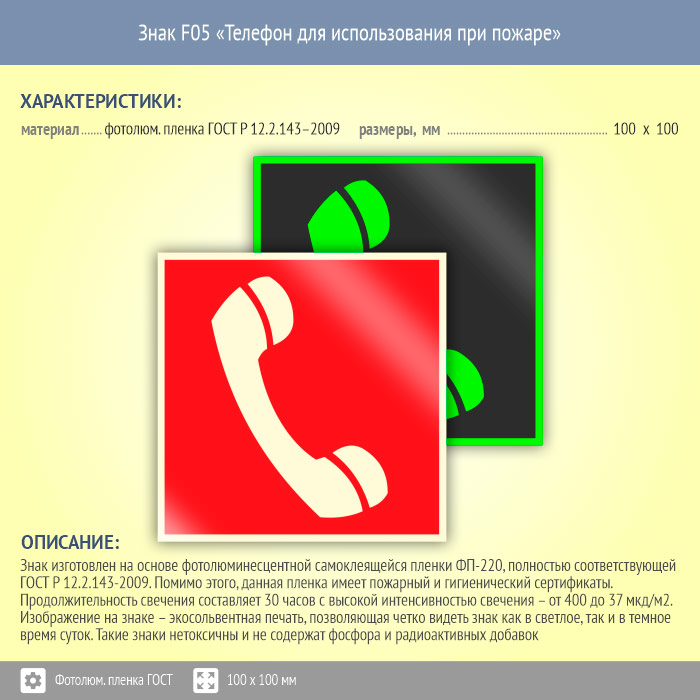 Знак F05 «Телефон для использования при пожаре (в том числе телефон прямой связи с пожарной охраной)» (фотолюминесцентная пленка ГОСТ 34428-2018, 100х100 мм) в Волжском купить