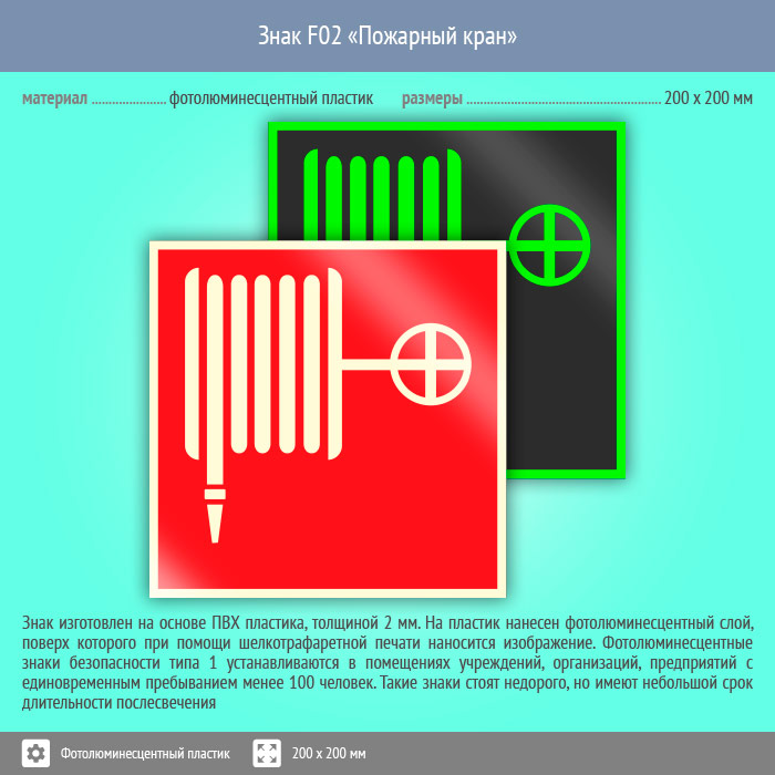Знак F02 «Пожарный кран» (фотолюминесцентный пластик, 200х200 мм) в Волжском купить