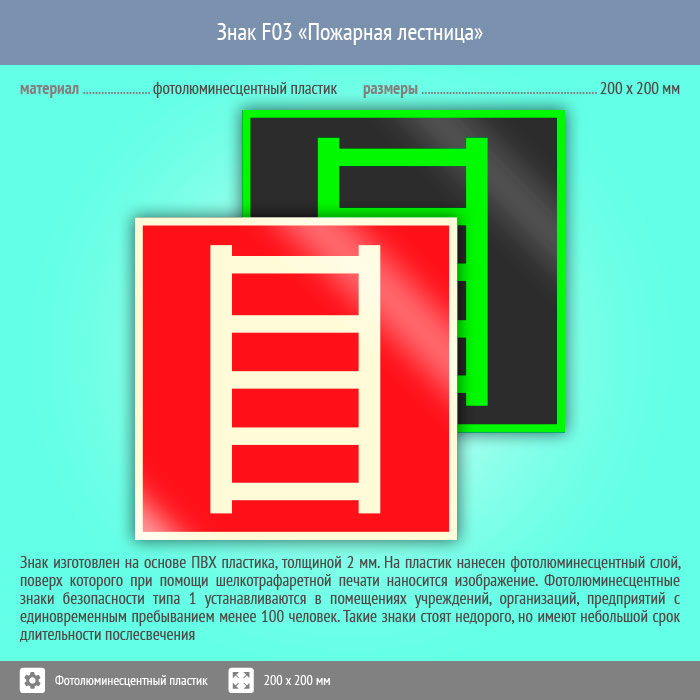 Знак F03 «Пожарная лестница» (фотолюминесцентный пластик, 200х200 мм) в Волжском купить