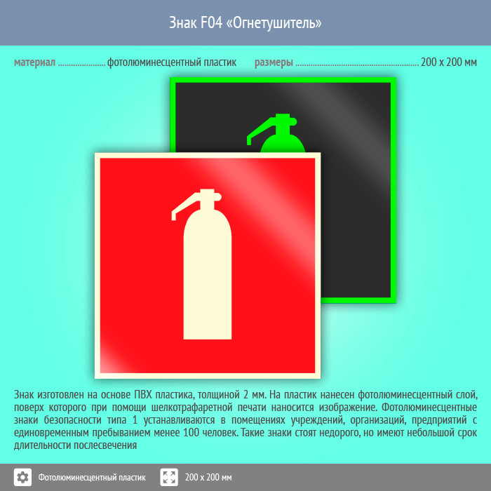 Знак F04 «Огнетушитель» (фотолюминесцентный пластик, 200х200 мм) в Волжском купить