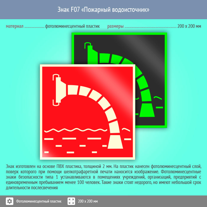 Знак F07 «Пожарный водоисточник» (фотолюминесцентный пластик, 200х200 мм) в Волжском купить