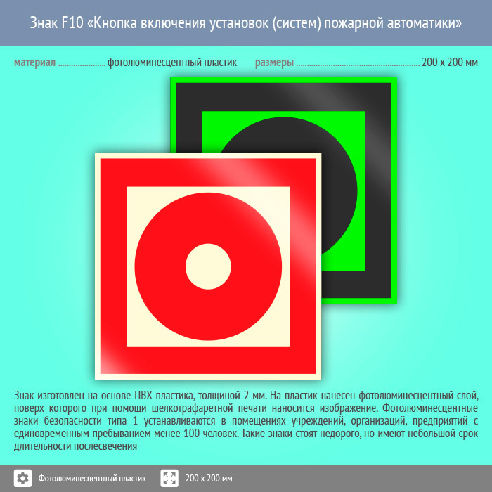 Знак F10 «Кнопка включения установок (систем) пожарной автоматики» (фотолюминесцентный пластик, 200х200 мм) в Волжском купить