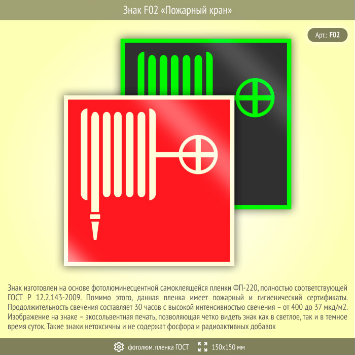 Знак F02 «Пожарный кран» (фотолюминесцентная пленка ГОСТ 34428-2018, 150х150 мм) в Волжском купить