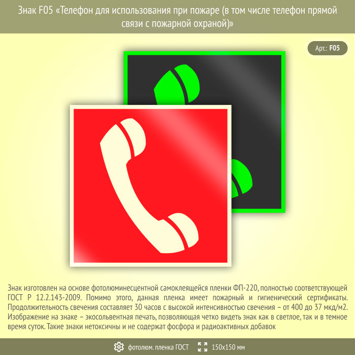 Знак F05 «Телефон для использования при пожаре (в том числе телефон прямой связи с пожарной охраной)» (фотолюминесцентная пленка ГОСТ 34428-2018, 150х150 мм) в Волжском купить