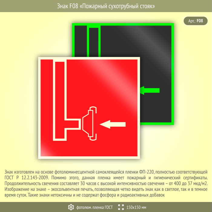 Знак F08 «Пожарный сухотрубный стояк» (фотолюминесцентная пленка ГОСТ 34428-2018, 150х150 мм) в Волжском купить