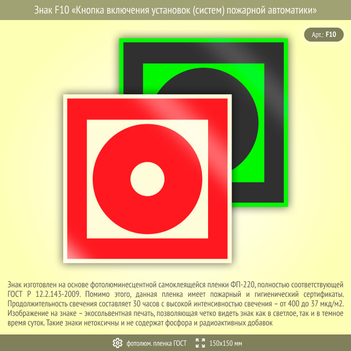 Знак F10 «Кнопка включения установок (систем) пожарной автоматики» (фотолюминесцентная пленка ГОСТ 34428-2018, 150х150 мм) в Волжском купить