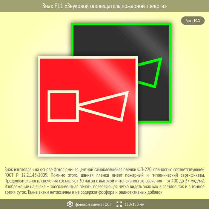 Знак F11 «Звуковой оповещатель пожарной тревоги» (фотолюминесцентная пленка ГОСТ 34428-2018, 150х150 мм) в Волжском купить