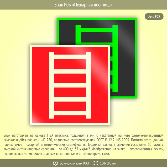 Знак F03 «Пожарная лестница» (фотолюминесцентный пластик ГОСТ 34428-2018, 100х100 мм) в Волжском купить