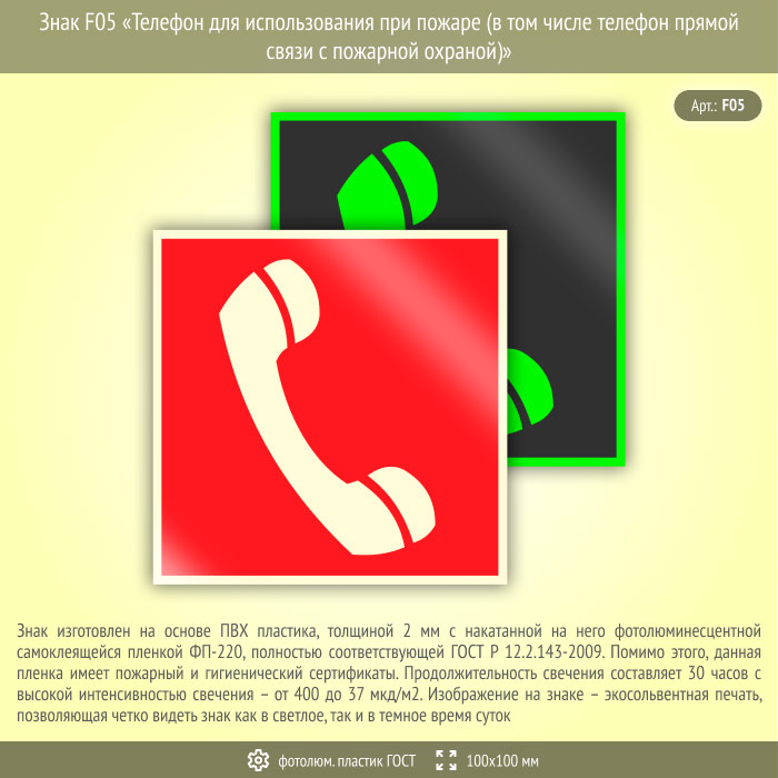 Знак F05 «Телефон для использования при пожаре (в том числе телефон прямой связи с пожарной охраной)» (фотолюминесцентный пластик ГОСТ 34428-2018, 100х100 мм) в Волжском купить