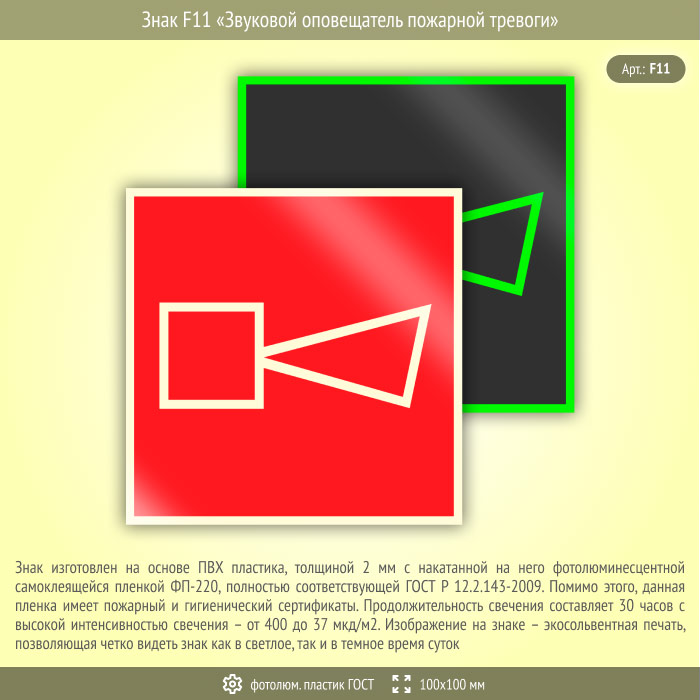 Знак F11 «Звуковой оповещатель пожарной тревоги» (фотолюминесцентный пластик ГОСТ 34428-2018, 100х100 мм) в Волжском купить