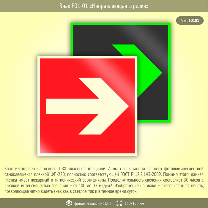 Знак F01-01 «Направляющая стрелка» (фотолюминесцентный пластик ГОСТ 34428-2018, 150х150 мм) в Волжском купить