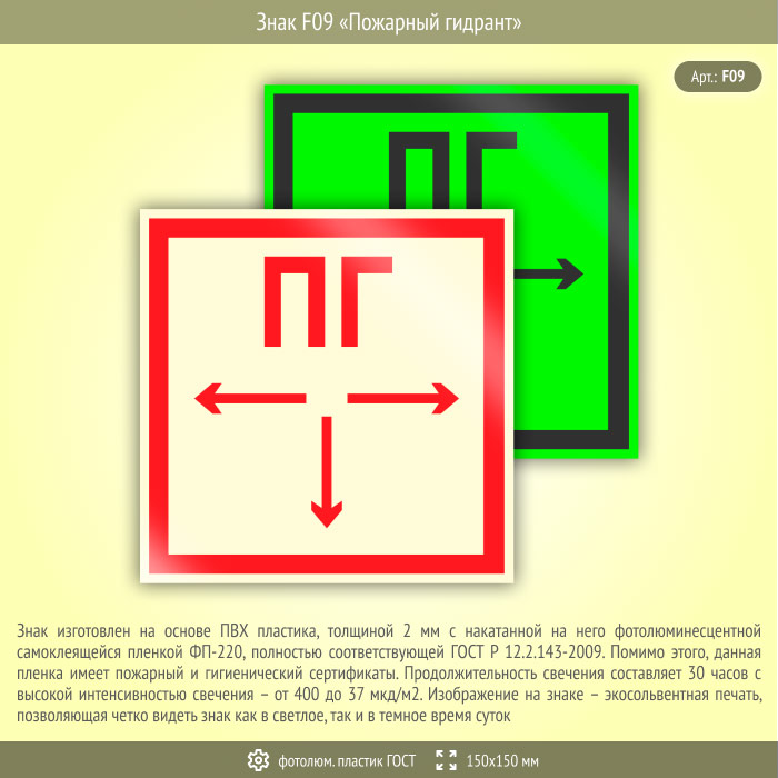 Знак F09 «Пожарный гидрант» (фотолюминесцентный пластик ГОСТ 34428-2018, 150х150 мм) в Волжском купить
