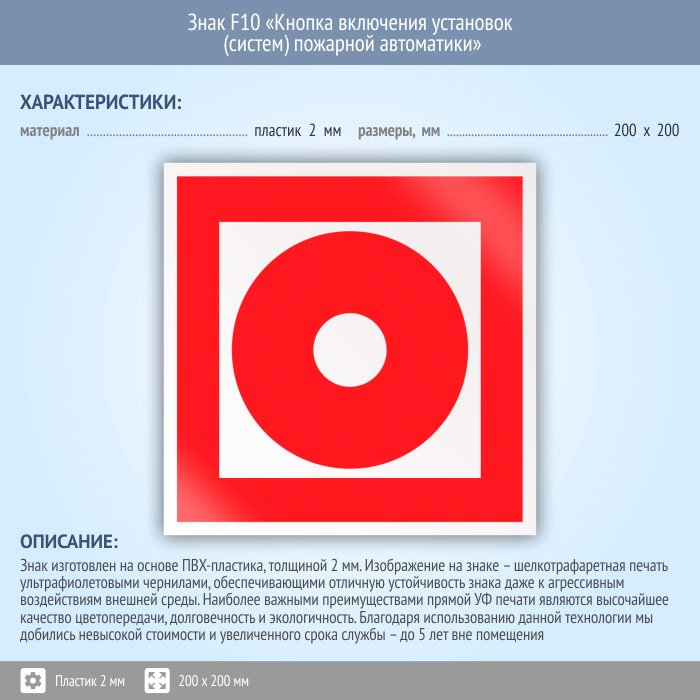 Знак F10 «Кнопка включения установок (систем) пожарной автоматики» (пластик, 200х200 мм) в Волжском купить