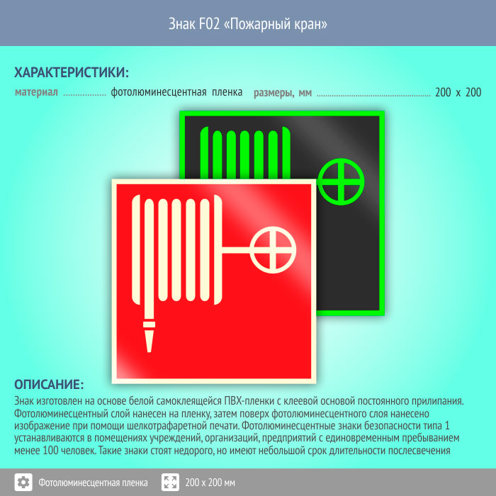 Знак F02 «Пожарный кран» (фотолюминесцентная пленка, 200х200 мм) в Волжском купить