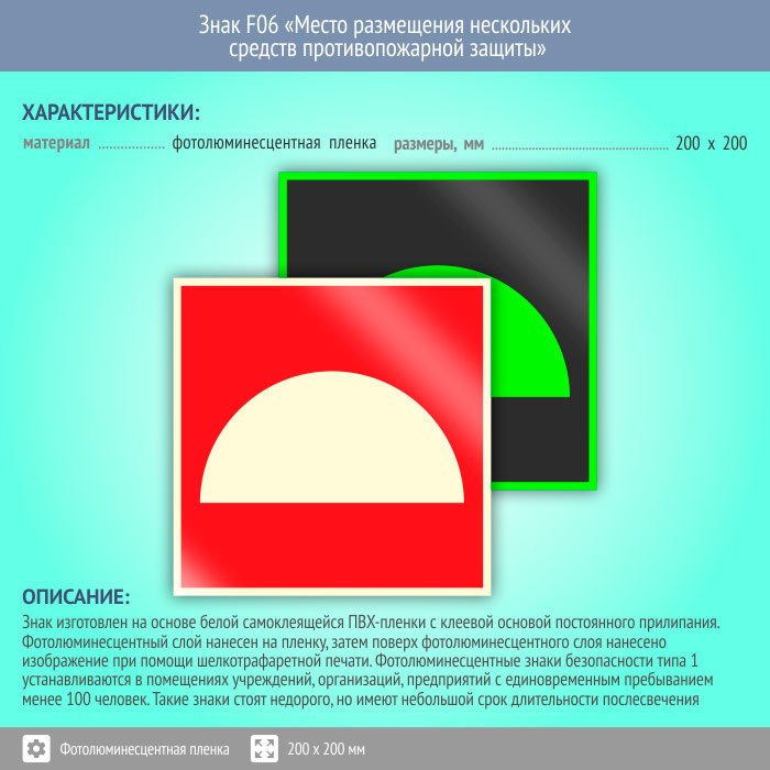 Знак F06 «Место размещения нескольких средств противопожарной защиты» (фотолюминесцентная пленка, 200х200 мм) в Волжском купить