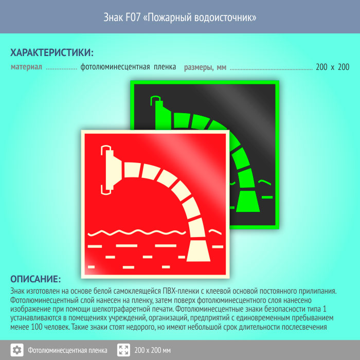 Знак F07 «Пожарный водоисточник» (фотолюминесцентная пленка, 200х200 мм) в Волжском купить
