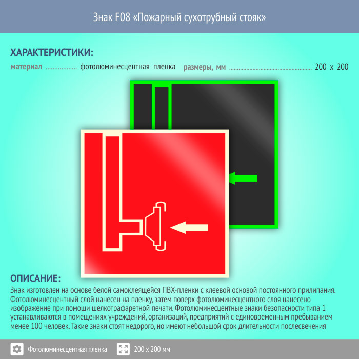 Знак F08 «Пожарный сухотрубный стояк» (фотолюминесцентная пленка, 200х200 мм) в Волжском купить