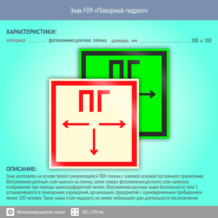 Знак F09 «Пожарный гидрант» (фотолюминесцентная пленка, 200х200 мм) в Волжском купить