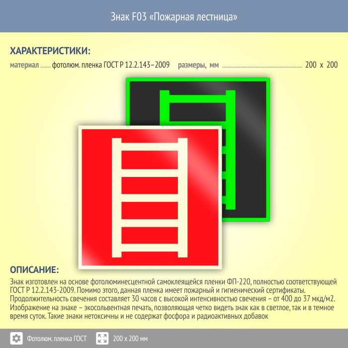 Знак F03 «Пожарная лестница» (фотолюминесцентная пленка ГОСТ 34428-2018, 200х200 мм) в Волжском купить