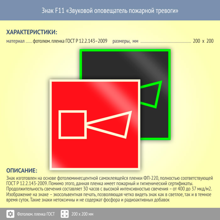 Знак F11 «Звуковой оповещатель пожарной тревоги» (фотолюминесцентная пленка ГОСТ 34428-2018, 200х200 мм) в Волжском купить
