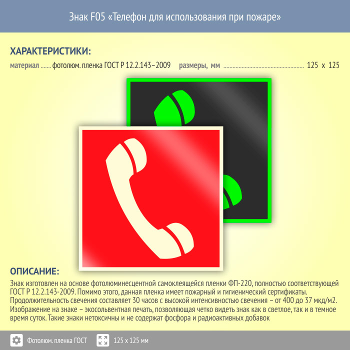 Знак F05 «Телефон для использования при пожаре (в том числе телефон прямой связи с пожарной охраной)» (фотолюминесцентная пленка ГОСТ 34428-2018, 125х125 мм) в Волжском купить