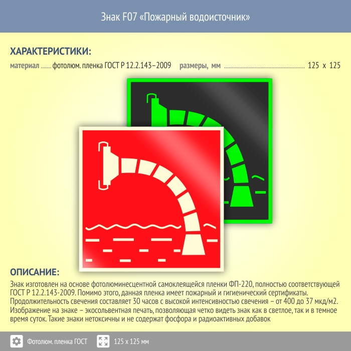 Знак F07 «Пожарный водоисточник» (фотолюминесцентная пленка ГОСТ 34428-2018, 125х125 мм) в Волжском купить