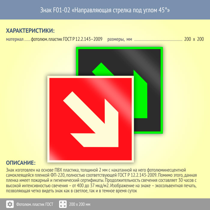 Знак F01-02 «Направляющая стрелка под углом 45°» (фотолюминесцентный пластик ГОСТ 34428-2018, 200х200 мм) в Волжском купить